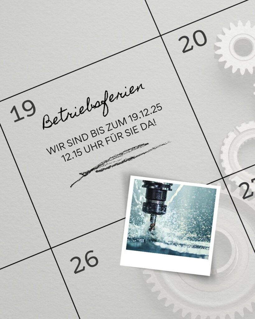 Nach einem intensiven Jahr voller Präzision, Maßarbeit und Späneflug gönnen wir unserem Team – uns unseren Maschinen – eine wohlverdiente Pause. Denn echte Qualität entsteht nicht nur durch moderne Technik, sondern auch durch ausgeruhte Köpfe und saubere Prozesse. Wir sind vom 22.12.2025 bis einschließlich 02.01.2026 in den Betriebsferien. In dieser Zeit ruht der Produktionsbetrieb. Ab dem 05.01.2026 sind wir wieder wie gewohnt für euch da – motiviert, präzise und bereit für neue Projekte.